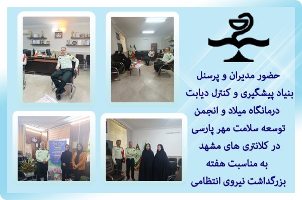 مدیران و پرسنل بنیاد دیابت، درمانگاه میلاد و انجمن توسعه سلامت مهر پارسی با حضور در کلانتری ها از تلاش ها و خدمات نیروهای وظیفه شناس نیروی انتظامی جهت برقراری امنیت در کشور قدردانی و تشکر کردند. همچنین با حضور در فرماندهی نیروی انتظامی مشهد با جناب محمد خدادادی دیدار و در این باره گفتگو کردند.